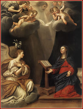 Considera al Arcángel Gabriel entrando a donde estaba María, para anunciarle que la Santísima Trinidad la ha elegido para ser Madre de Dios. Su humildad y su pudor alármanse ante esta noticia; pero es tranquilizada asegurándosele que será madre sin dejar de ser virgen. «Hágase en mí según tu palabra», exclama; y, al instante, con la sangre purísima de la Virgen Inmaculada, el Espíritu Santo forma el cuerpo adorable de Jesús.
