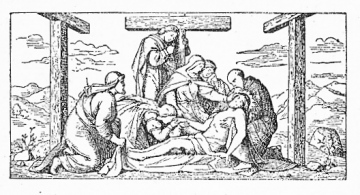 Contempla, alma cristiana, cómo José de Arimatea y Nicodemo, postrados a los pies de María, le piden el dulce objeto de sus caricias y ungiéndole con preciosos aromas le amortajan y ponen en un nuevo sepulcro de piedra.