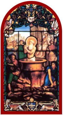 Estas palabras de Jesucristo anunciando al discípulo muy amado que bebería, también él, el cáliz de dolor, cumpliéronse cuando Domiciano lo hizo venir de Éfeso a Roma para martirizarlo. Fue lleva do fuera de la ciudad, frente a la puerta llamada Latina, y se lo sumergió en una caldera llena de aceite hirviendo; pero salió el santo de ella como de un baño refrescante, más fuerte y vigoroso de lo que entrara. Domiciano desterró al santo Apóstol a la isla de Patmos, donde compuso el Apocalipsis.