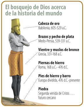 rey la interpretación. 37 Tú, oh rey, eres rey de reyes, a quien el Dios del cielo ha dado el imperio, el poder, la fuerza y la gloria. 38 Dondequiera que habiten los hijos de los hombres, las bestias del campo y las aves del cielo. Él los ha puesto en tu mano, y a ti te ha hecho señor de todos ellos. Tú eres la cabeza de oro. 39 Después de ti se levantará otro reino inferior a ti; y otro tercer reino de bronce, que dominará sobre toda la tierra. 40 Luego habrá un cuarto reino fuerte corno el hierro. Del mismo modo que el hierro todo lo destroza y rompe, y como el hierro todo lo desmenuza, así él desmenuzará y quebrantará todas estas cosas. 41 Si tú viste que los pies y los dedos eran en parte de barro de alfarero y en parte de hierro, (esto significa) que el reino será dividido. Habrá en él algo de la fortaleza del hierro, según viste en el hierro mezclado con barro de lodo. 42 Los dedos de los pies eran en parte de hierro, y en parte de barro, (esto significa) que el reino será en parte fuerte, y en parte endeble. 43 Así como viste el hierro mezclado con barro, así se mezclarán por medio de simiente humana; pero no se pegarán unos con otros; así como el hierro no puede ligarse al barro. 44 En los días de aquellos reyes el Dios del cielo suscitará un reino que nunca jamás será destruido, y que no pasará a otro pueblo; quebrantara y destruirá todos aquellos reinos, en tanto que él mismo subsistirá para siempre, 45 conforme viste que de la montaña se desprendió una piedra —no por mano alguna—, que desmenuzó el hierro, el bronce, el barro, la plata y el oro. El gran Dios ha mostrado al rey lo que ha de suceder en lo porvenir. El sueño es verdadero, y es fiel la interpretación.”