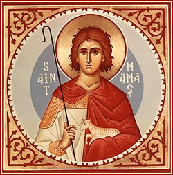 San Mammes, hijo de un pastor de Cesarea en Capadocia, unió la piedad a la pobreza, y coronó con el martirio una vida llena de sufrimientos y privaciones. Sus virtudes fueron celebradas por dos grandes doctores de la Iglesia: San Basilio y San Gregorio Nacianceno. Cuenta este último, como oído de un testigo ocular, que, en su juventud, Juliano el Apóstata y su hermano Galo intentaron edificar, cada uno una mitad, una iglesia sobre la tumba del santo; pero después de inútiles esfuerzos para asentar los cimientos de la parte que tocara a Juliano, fue menester renunciar a la empresa.