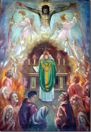 El Ofertorio recuerda que S. Miguel es quien introduce las almas en el cielo, porque, dicen las oraciones de la recomendación del alma, él es el Jefe de la milicia celestial, entre la cual se han de poner los hombres, ocupando los sitiales dejados vacíos por los ángeles malos. «Las almas del Purgatorio, declara el Concilio de Trento son socorridas por los sufragios de los fieles y, señaladamente por el Sacrificio del altar». Y la razón es que, en la Santa Misa el sacerdote ofrece oficialmente a Dios el precio de las almas: la Sangre del Salvador. Jesús mismo está presente bajo las especies de pan y vino, que recuerdan al Padre el Sacrificio del Gólgota. y asegura la aplicación de su virtud expiatoria a esas almas. Asistamos en este día al Santo Sacrificio de la Misa. En él pide la Iglesia a Dios conceda a los difuntos. que no pueden valerse a sí mismos, la remisión de todos sus pecados (Or.) yel eterno descanso (Intr., Grad., Com.). Visitemos los cementerios en donde descansan sus cuerpos(2), hasta el día en que suene la trompeta y resuciten para revestirse de la inmortalidad y alcanzar, por Jesucristo, la victoria sobre la muerte (Ep.) |