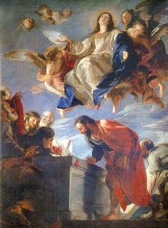 27. Además, los doctores escolásticos vieron indicada la Asunción de la Virgen Madre de Dios no sólo en varias figuras del Antiguo Testamento, sino también en aquella Señora vestida de sol, que el apóstol Juan contempló en la isla de Patmos (Ap 12, 1s.). Del mismo modo, entre los dichos del Nuevo Testamento consideraron con particular interés las palabras «Dios te salve, María, llena eres de gracia, el Señor es contigo, bendita tú eres entre todas las mujeres» (Lc 1, 28), porque veían en el misterio de la Asunción un complemento de la plenitud de gracia concedida a la bienaventurada Virgen y una bendición singular, en oposición a la maldición de Eva.