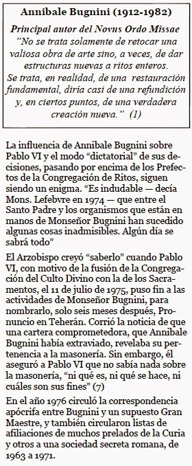 “En diciembre de 1967, durante una asamblea de la Unión Mundial de los Superiores Generales a la que asistió Monseñor Lefebvre, el Padre Annibale Bugnini fue invitado a exponer su misa normativa. Lo hizo con gran tranquilidad: para la participación de los fieles — dijo — había que cambiar toda la primera parte de la misa, suprimir el Ofertorio (que sobraba al lado del Canon) y las oraciones del sacerdote antes de la comunión, cambiar y diversificar las oraciones eucarísticas, etc. “Mientras oía esa conferencia, que duró una hora contaba Monseñor Lefebvre —, me decía a mí mismo: ‘¡No puede ser que ese hombre tenga la confianza del Santo Padre, y que el Papa lo haya elegido para hacer la reforma de la liturgia!’ Teníamos ante nosotros a un hombre que pisoteaba la liturgia antigua con un desprecio y un descaro inimaginables. Yo, que suelo tomar la palabra con facilidad, como lo había hecho en el Concilio, no tuve valor para ponerme de pie; estaba consternado; las palabras se me atragantaban. Sin embargo, se levantaron dos Superiores Generales. El primero dijo: “¡Padre, si entiendo bien, después de suprimir el Confiteor y el Ofertorio, acortar el Canon, etc., una misa privada durará entre diez y doce minutos!” El Padre Bugnini respondió: –“¡Siempre se puede añadir algo más!”.