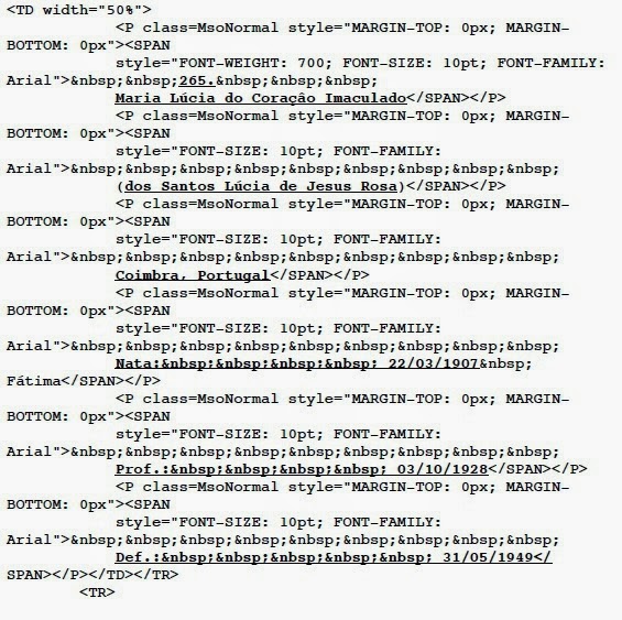 «El cuadro 265 enlista correctamente la fecha de nacimiento y de profesión: nació el 22 de marzo de 1907 en Fátima, e hizo sus primeros votos como Hermana Dorotea el 3 de octubre de 1928. Pero es difícil entender por qué el sitio oficial de documentos puso como la fecha de su fallecimiento el 31 de mayo de 1949. Tal vez porque ella realmente murió en aquella fecha, y otra persona, que falleció en 2005, haya tomado su lugar».