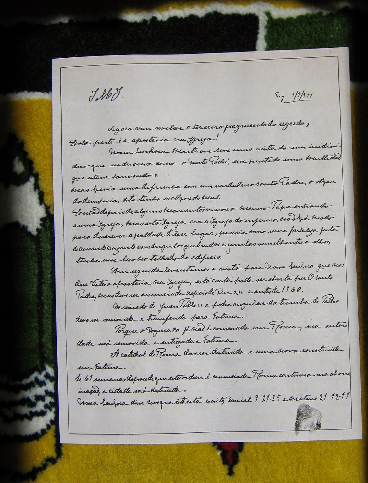 Este sería el texto auténtico del Tercer Secreto de Fátima, fotografiado en 2010 y transmitido vía faxsimil a Tradition in Action: