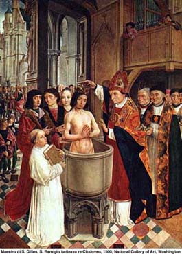 La escena misma del bautismo, aun exponiéndonos a mezclar los hechos estrictamente históricos con detalles subjetivos del cronista, vale la pena reproducirla como nos la refiere San Gregorio. En efecto, con el objeto de impresionar los sentidos de aquel pueblo bárbaro con las solemnes ceremonias del bautismo, San Remigio y la reina Clotilde procuraron que la ciudad de Reims, donde se realizó probablemente este gran acto, se engalanara con toda magnificencia y que la catedral y el baptisterio aparecieran con los esplendores de las grandes fiestas. Luego añade el historiador: “El nuevo Constantino avanza hacia el baptisterio. Cuando hubo entrado en él, en presencia de todo el pueblo y de la corte entera que lo contemplaba, el obispo Remigio le dice: “Inclina humildemente tu cabeza; adora lo que hasta ahora has quemado: quema lo que hasta aquí has adorado”. Así, pues, habiendo hecho Clodoveo la profesión de fe en Dios omnipotente y en la Trinidad, fue bautizado en el nombre del Padre, del Hijo y del Espíritu Santo”.