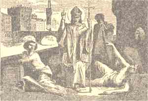 Concurrieron pues todos contritos a la iglesia, a celebrar el misterio en la vigilia de la gloriosa noche: pero habiéndose incendiado varias casas principales de la ciudad, huyeron del templo despavoridos. Solo el santo obispo quedó en la iglesia, implorando con entrañables gemidos la divina misericordia, y fue tan grande la eficacia de sus lágrimas, que presto se apagó aquel grande incendio, y los fieles volvieron para continuar su penitencia a los oficios divinos. En esta ocasión ordenó el santo obispo tres días de rogativas públicas acompañadas de ayunos y oraciones, en los días que preceden a la fiesta de la Ascensión de nuestro Señor Jesucristo, a los cuales concurrió toda la ciudad con grande compunción, lágrimas y gemidos, y desde entonces se vio libre de las calamidades que la oprimían.